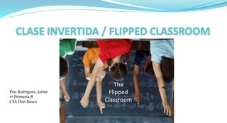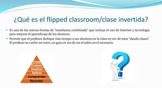Este documento describe la clase invertida o flipped classroom, un método de enseñanza que involucra el uso de tecnología para que los estudiantes aprendan el material fuera del aula y apliquen los conocimientos en clase con la guía del profesor. En una clase invertida, los estudiantes estudian el contenido por su cuenta usando videos u otros recursos antes de ir a clase, donde resuelven problemas y hacen trabajos prácticos con la ayuda del profesor.