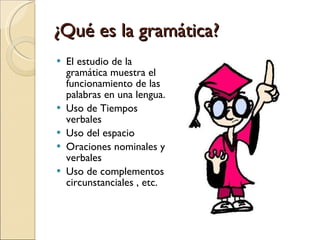 El documento describe los componentes de la gramática de la lengua de señas argentina (LSA). Explica que se basa en el uso diferencial del espacio y tiempo, en lugar del sonido como en el lenguaje oral. Detalla las formas de construir oraciones en LSA usando el espacio, tiempo, cambios, pausas e ímpetu. También compara las diferencias y semejanzas entre la gramática de la lengua oral y de señas, e incluye ejemplos de oraciones en LSA.