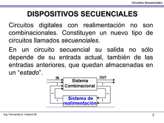 Este documento trata sobre circuitos secuenciales digitales. Explica que estos circuitos tienen realimentación y su salida depende no solo de la entrada actual sino también de entradas anteriores almacenadas en un "estado". Describe los diferentes tipos de biestables como latch y flip-flop, asíncronos y síncronos, y sus usos. Finalmente explica en detalle los latch tipo S-R, S'-R' y D, incluyendo sus diagramas de flujo y circuitos integrados asociados.