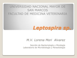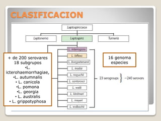 El documento presenta información sobre el género Leptospira, destacando sus características, clasificación, reservorios y métodos de diagnóstico. Se menciona que son bacterias patógenas de formas helicoidales que pueden generar infecciones en humanos y animales a través del contacto con fluidos infectados. Además, se describen los métodos de cultivo y pruebas serológicas necesarias para su identificación.