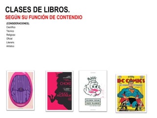 Este documento proporciona una definición del libro y describe sus partes principales, incluyendo las exteriores (tapas, lomo, sobrecubierta), el pliego de principios (portadilla, portada, índice) y los finales (anexos, apéndices, bibliografía). También explica los diferentes tipos de libros, encuadernaciones, y formas de imponer páginas para distintos números de hojas.