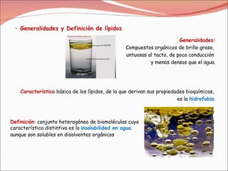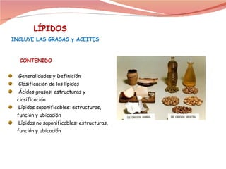 El documento habla sobre los lípidos, incluyendo su definición general, clasificación y estructuras principales. Explica que los lípidos saponificables contienen ácidos grasos y son estructuras como los triacilglicéridos, fosfolípidos y ceras, mientras que los no saponificables no los contienen, como los esteroides, terpenos y prostaglandinas. También describe las características de los ácidos grasos saturados e insaturados y su presencia en diferentes especies.