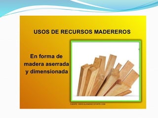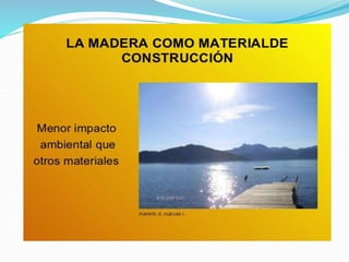 El documento proporciona información sobre la historia y uso de la madera como material de construcción. Explica que las casas de troncos fueron uno de los primeros estilos de construcción y aún se usan. Luego describe las diferentes clasificaciones, propiedades y usos de la madera, incluidos usos históricos, modernos y en la industria. Finalmente, brinda datos sobre la producción y comercio mundiales de madera.