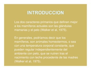 Los mamíferos se caracterizan principalmente por poseer glándulas mamarias y pelo. Son animales homeotermos con temperatura corporal constante. Aunque actualmente están distribuidos por todo el planeta, sus orígenes se remontan a hace 200 millones de años como pequeños organismos nocturnos e insectívoros en un mundo dominado por reptiles.