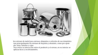 El documento clasifica los materiales utilizados para empaques y embalajes, mencionando que los embalajes de madera solían ser útiles pero han disminuido debido a requisitos sanitarios y materiales alternativos como el cartón y plástico. Explica que se usan diferentes papeles y cartones como el kraft, encerado, gris y corrugado, detallando sus usos comunes como bolsas, envases de alimentos, cartonaje, cajas y embalajes.