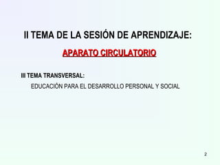 Este documento presenta la planificación de una sesión de aprendizaje sobre el aparato circulatorio para estudiantes de segundo grado. Incluye información sobre el nivel educativo, área curricular, fecha y docente. El tema principal es el aparato circulatorio y el tema transversal es la educación para el desarrollo personal y social. Se describen valores como la solidaridad y tolerancia. La sesión incluye actividades como lectura, discusión en grupos y presentaciones para desarrollar capacidades como comprensión e indagación. La evaluación considera