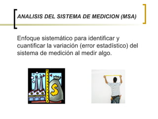 El análisis del sistema de medición (MSA) es un enfoque sistemático para identificar y cuantificar la variación en los sistemas de medición utilizados en la industria automotriz, abordando la precisión y exactitud de estos procesos. Se enfatiza la importancia de la calibración y el control de variaciones para asegurar resultados válidos, además de resaltar el uso de estudios de gage R&R para evaluar la repetibilidad y reproducibilidad. La norma ISO/IEC 17025 establece requisitos para la competencia de laboratorios de ensayo y calibración, asegurando la calidad de los resultados y la conformidad con las especificaciones del producto.