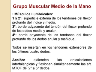 El documento describe los músculos intrínsecos de la mano, dividiéndolos en tres grupos: el grupo medio (lumbricales e interóseos dorsales y palmares), el grupo lateral de la eminencia tenar (músculos del pulgar), y el grupo medial de la eminencia hipotenar (músculos del meñique). Cada grupo contiene músculos que producen acciones como la flexión, extensión, abducción y oposición de los dedos.