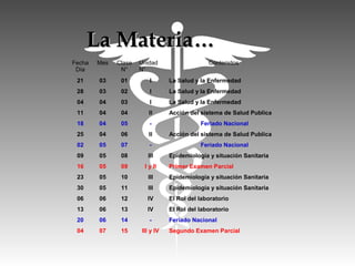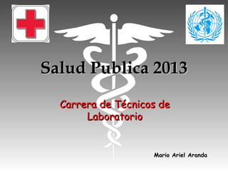 El documento presenta el cronograma de la materia Salud Pública 2013 de la carrera de Técnicos de Laboratorio. Se detalla la distribución de las clases a lo largo del año con las fechas, unidades temáticas y contenidos abordados. Se incluyen dos exámenes parciales para evaluar los bloques temáticos tratados en las primeras clases.