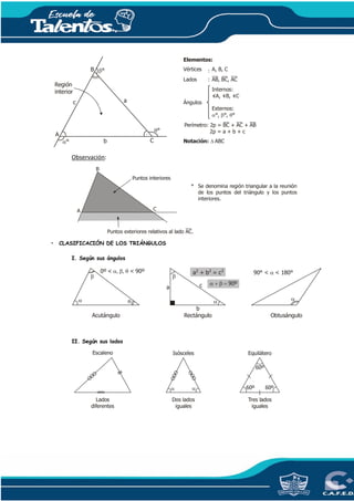 Este documento clasifica los triángulos según sus ángulos y lados, y describe sus propiedades principales. Explica que los triángulos pueden ser agudos, rectos u obtusos dependiendo de la medida de sus ángulos internos, y escalenos, isósceles o equiláteros según la longitud de sus lados. También enumera fórmulas para calcular el perímetro y ángulos externos de un triángulo, así como propiedades geométricas como la suma de sus ángulos internos.