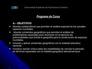 El documento presenta los objetivos y contenidos de un curso sobre la construcción de los territorios mundiales. Los objetivos incluyen abordar problemáticas espaciales de los espacios mundiales actuales y analizar la dimensión geográfica de América Latina. Los contenidos cubren temas como el escenario geográfico mundial, la producción social, cultural, económica y política de los espacios, y la producción del espacio latinoamericano considerando sus dimensiones natural, social, cultural, económica y política.