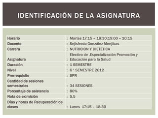 Este documento presenta la asignatura "Especialización en Educación y Promoción para la Salud" impartida por el Profesor Sejisfredo González. La asignatura se imparte en el 6° semestre de la carrera de Nutrición y Dietética. Cubre temas relacionados con la educación para la salud, teorías de modificación de conducta, estrategias de educación nutricional y promoción en salud. Los estudiantes serán evaluados a través de certámenes, trabajos grupales, informes y una actividad práct