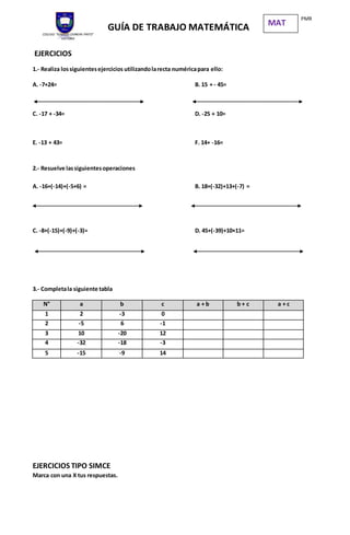 Este documento presenta una guía de trabajo de matemáticas sobre la adición de números enteros. Explica que para sumar números del mismo signo se suman sus valores absolutos y conservan el signo, mientras que para números de distinto signo se restan los valores absolutos y se conserva el signo del número de mayor valor absoluto. Incluye ejercicios de adición de números enteros para que los estudiantes practiquen resolviéndolos.