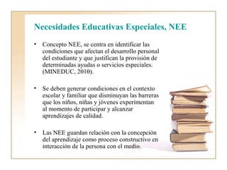 Este documento trata sobre las necesidades educativas especiales (NEE) y la educación inclusiva. Explica que las NEE pueden ser permanentes o transitorias y están asociadas a discapacidades o trastornos. También describe la diferencia entre integración e inclusión, señalando que la inclusión considera la diversidad de todos los estudiantes. Finalmente, destaca los desafíos de los educadores para promover aulas inclusivas que garanticen calidad y equidad en la educación.