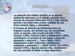 El proceso de atención de enfermería (PAE) es un método sistemático que consta de cinco etapas (valoración, diagnóstico, planificación, ejecución y evaluación) para satisfacer las necesidades del paciente. El PAE permite a las enfermeras prestar cuidados de manera racional mediante la identificación de problemas, el establecimiento de planes de cuidado individualizados, y la evaluación continua de los resultados.