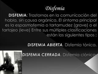 El documento aborda la disfemia o tartamudez en niños, destacando el caso de un estudiante de 4 años en tratamiento, y la colaboración activa de sus padres, aunque con un desconocimiento de la problemática. Se analizan los síntomas, tipos y causas de la tartamudez, así como su prevalencia, y se subraya la importancia de la intervención temprana y el apoyo familiar en su tratamiento. Además, se presentan pautas para adultos sobre cómo apoyar a los niños con tartamudez para evitar empeorar la situación.