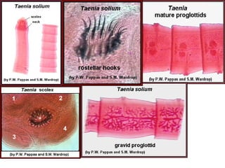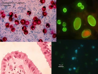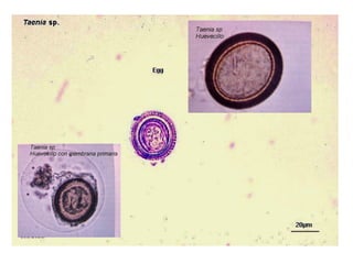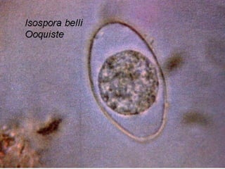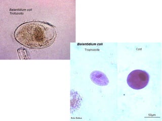 El documento proporciona información sobre parásitos intestinales como Entamoeba histolytica, Giardia lamblia y Ascaris lumbricoides. Describe sus ciclos de vida, síntomas, diagnóstico y tratamiento de las infecciones que causan. La amibiasis puede ser asintomática o causar diarrea sanguinolenta, y se diagnostica mediante el examen de heces. La giardiasis puede causar diarrea acuosa y malabsorción, y se diagnostica hallando quistes o trofozoitos en muestr