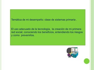 Este documento presenta una lección sobre el uso seguro y apropiado de la tecnología y las redes sociales para niños en primaria. Incluye enlaces a videos e información sobre temas como la tecnología, Internet, uso de cámaras web y cyberbullying. La actividad final pide a los estudiantes que creen su propia cuenta en una red social segura para niños, como Club Penguin o Moshi Monsters, con la supervisión de sus padres.