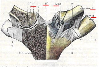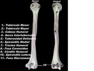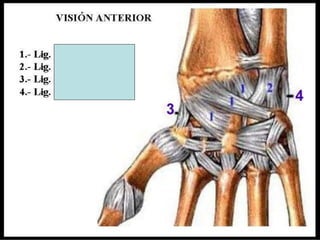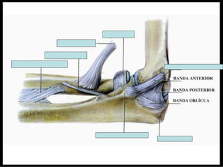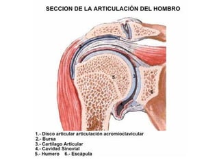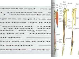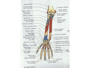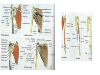El documento instruye en la identificación de estructuras óseas y musculares del hombro y la mano. Se pide identificar superficies articulares, sitios de inserción ósea y ligamentos del hombro, así como huesos de la mano. Luego se solicita dibujar y especificar origen, inserción y acción de músculos del hombro y flexores y extensores de la muñeca y dedos.