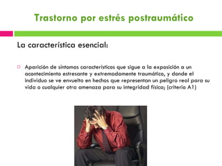El documento describe el trastorno de estrés postraumático (TEP), incluyendo sus criterios diagnósticos, síntomas, curso y tratamiento. El TEP se caracteriza por la reexperimentación persistente de un evento traumático, evitación de estímulos relacionados y síntomas de activación que duran más de un mes y causan malestar clínico significativo. Los eventos traumáticos que pueden causar TEP incluyen desastres, accidentes graves, agresión física o sexual y enfermedades potencialmente mortales