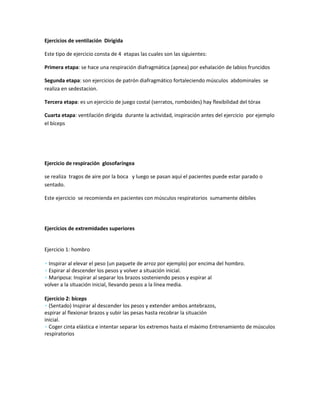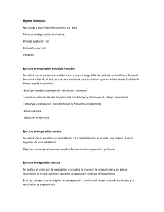 Este documento describe varios ejercicios y técnicas de higiene bronquial para mejorar la función pulmonar. Incluye ejercicios respiratorios como la respiración diafragmática y torácica, así como ejercicios para las extremidades superiores e inferiores que se coordinan con la respiración. También describe técnicas para la eliminación de secreciones como la expectoración asistida y ejercicios para la rehabilitación de pacientes con agudizaciones pulmonares. El objetivo general es mejorar la ventilación