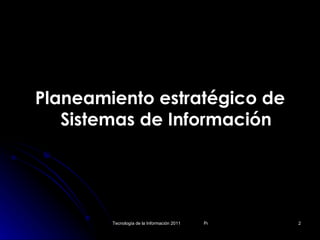 El documento describe las etapas clave de la planeación estratégica de sistemas de información. Incluye establecer metas, determinar prioridades de proyectos evaluando factores estratégicos y de factibilidad, y evaluar los recursos y capacidad del sistema para garantizar el éxito de los proyectos planeados. La planeación estratégica es fundamental para evitar problemas como sistemas incompatibles y asegurar que los proyectos apoyen las metas de la organización.
