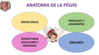 Este documento describe la anatomía de la pelvis femenina. Explica las partes óseas, músculos, ligamentos, fascias, vasos sanguíneos y nervios que componen la pelvis, así como los órganos contenidos en ella como el útero, ovarios, trompas de Falopio, vejiga, ureteres, uretra, vagina, recto y estructuras perineales. Proporciona detalles sobre la función y estructura de cada una de estas partes y órganos de la pelvis femenina.