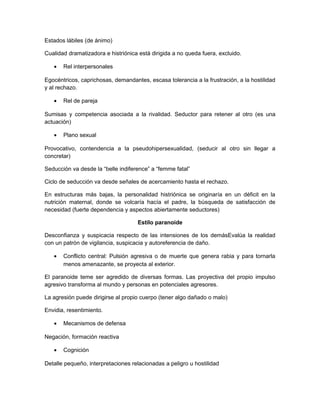El documento describe los principales estilos de personalidad desde una perspectiva psicoanalítica, incluyendo los estilos obsesivo, histérico, paranoide, esquizoide, evitativo y narcisista. Para cada estilo, se describen el conflicto central, mecanismos de defensa, cognición, relaciones interpersonales y otros aspectos clave. Los estilos no son patológicos por sí mismos, pero pueden volverse rígidos y patológicos.