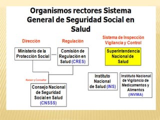 Este documento resume los antecedentes y el marco normativo de la salud en Colombia. Explica que la Constitución de 1991 y la Ley 100 de 1993 establecieron el derecho fundamental a la salud y crearon el Sistema General de Seguridad Social en Salud. El sistema se basa en principios como la universalidad, solidaridad e integralidad para garantizar el acceso a los servicios de salud a toda la población a través de los regímenes contributivo y subsidiado.
