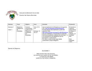 Este documento presenta una guía para una clase sobre silogismos categóricos de Aristóteles. Incluye el tema, objetivo, hora, actividad y evaluación para la primera semana. Como actividad, los estudiantes analizarán silogismos propuestos por Aristóteles y construirán uno propio. Se evaluará la actitud, tiempo y resultado.