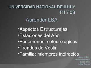 El documento trata sobre varios temas relacionados con la lengua de señas incluyendo sus aspectos estructurales, estaciones del año, fenómenos meteorológicos, prendas de vestir y miembros de la familia indirecta. Describe los componentes constitutivos de las señas como la configuración, localización, orientación y movimiento de las manos y cómo participan el espacio, las miradas y la expresión facial. También lista ejemplos de estaciones, fenómenos climáticos, prendas de vestir y parientes políticos.