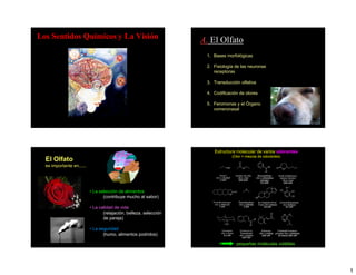 Este documento describe la anatomía y fisiología del sentido del olfato. Explica la estructura del epitelio olfatorio, las neuronas sensoriales olfatorias y sus cilios, y los mecanismos de transducción olfativa a nivel celular y molecular, incluyendo los receptores de olores y su especificidad por moléculas odoríferas.