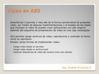 ActionScript 3 permite presentar video de forma no convencional mediante la implementación de clases de video. Se pueden cargar videos desde un servidor o localmente, o capturar video de una cámara del usuario. La clase Video muestra el video y la clase NetStream controla la reproducción del video cargado a través de una conexión NetConnection.