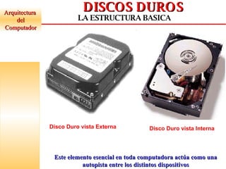 El documento describe las partes principales de un disco duro, incluyendo la estructura interna con cabezales de lectura y escritura, platos, pistas y sectores. Explica cómo se particiona un disco duro en unidades lógicas más pequeñas usando herramientas como FDISK y cómo se formatea para prepararlo para el almacenamiento de datos. También menciona algunos fabricantes comunes de discos duros como Samsung y herramientas de trabajo como Disk Manager y Partition Magic.