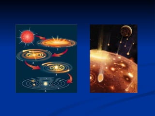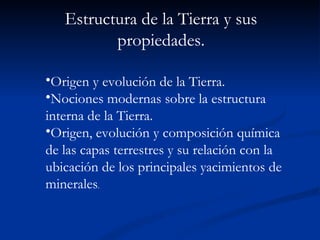 Este documento describe la formación y estructura interna de la Tierra. Explica cómo se formó la Tierra hace aproximadamente 4,500 millones de años a partir de una nube de gas y polvo interestelar que colapsó, y cómo su diferenciación interna dio lugar a una corteza, manto y núcleo. También cubre la teoría de placas tectónicas y cómo las placas se mueven continuamente, lo que ha dado forma a la configuración actual de los continentes y océanos a lo largo de miles de millones de años.
