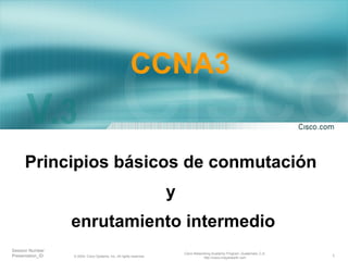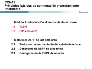 Este documento presenta los módulos de un curso CCNA3 sobre principios básicos de conmutación y enrutamiento intermedio. Los módulos cubren temas como VLSM, RIP v2, OSPF, EIGRP, conceptos de conmutación, switches, configuración de switches, protocolo spanning-tree, VLANs, protocolo troncal de VLAN, y un caso de estudio.