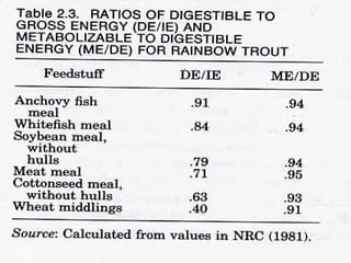Este documento trata sobre bioenergética y partición de energía en organismos acuáticos. Explica que los organismos requieren una provisión constante de energía para mantener la vida, la cual obtienen de fuentes como alimento, productividad natural y reservas corporales. Describe cómo la energía ingerida es particionada para procesos como síntesis de tejidos, osmoregulación y reproducción. También cubre conceptos como energía bruta, digerible y metabolizable.