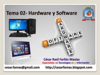 Este documento explica los conceptos básicos de hardware y software de computadoras. Define una computadora como un mecanismo electrónico que acepta información de entrada, la procesa y produce información de salida. Explica que el hardware son las partes físicas de la computadora como la memoria, CPU, disco duro, monitor, teclado y mouse. El software son las instrucciones necesarias para realizar tareas y se divide en software de sistema como el sistema operativo y software de aplicación.