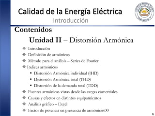 Este documento trata sobre la distorsión armónica en la calidad de la energía eléctrica. Explica que la distorsión armónica es causada por equipos no lineales y se debe al análisis de Fourier, donde las ondas senoidales distorsionadas pueden expresarse como la suma de ondas senoidales puras de frecuencias múltiplos de la frecuencia fundamental. También describe las principales fuentes de armónicos en plantas industriales y algunos de los efectos dañinos que pueden causar en equipos eléctricos.