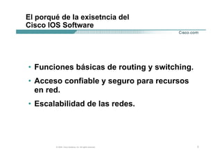 El documento describe los conceptos básicos de los routers Cisco, incluyendo el software Cisco IOS y su interfaz de línea de comandos. Explica cómo inicializar un router, los diferentes modos del CLI, y cómo establecer una sesión de consola serial para acceder al router.