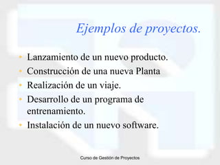 El documento define un proyecto como un emprendimiento temporal para lograr un resultado único. Explica que los proyectos tienen objetivos específicos, actividades y entregables definidos. También describe los procesos clave de la gestión de proyectos como la planificación, ejecución, control y cierre de cada área funcional para asegurar que el proyecto se complete a tiempo, dentro del presupuesto y cumpla con los objetivos. Finalmente, enfatiza la importancia de definir claramente el alcance del proyecto para facilitar su gestión y monit