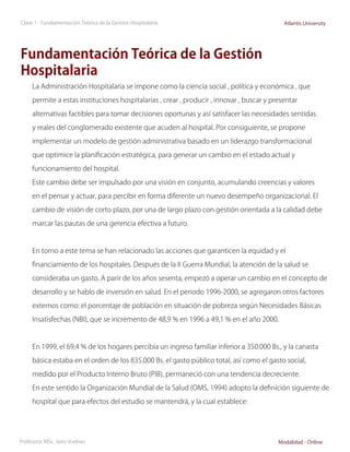 Este documento presenta los fundamentos teóricos de la gestión hospitalaria. Explica que los hospitales deben ser gestionados como empresas para ser más eficientes y satisfacer las necesidades de los pacientes. También describe la evolución de los hospitales y cómo su misión ha cambiado a través del tiempo para enfocarse más en la prevención, calidad y sostenibilidad financiera.