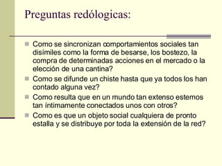 El documento trata sobre las redes sociales y las tecnologías de la colaboración. Explora cómo se sincronizan comportamientos sociales a gran escala y cómo se difunden ideas y objetos sociales rápidamente a través de las redes. También discute conceptos como la mediología, los programas de investigación, el capital social y el capital comunicacional en el contexto de las redes y la comunicación.