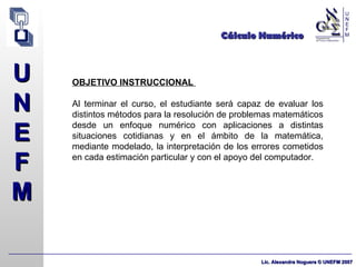 El documento presenta los objetivos e información general sobre un curso de Cálculo Numérico. Introduce los temas de métodos numéricos, aproximaciones, errores de redondeo y exactitud vs precisión. Explica que los métodos numéricos permiten resolver problemas matemáticos mediante cálculos, y que la computadora mejora la eficiencia. También define conceptos como error de truncamiento y de redondeo.