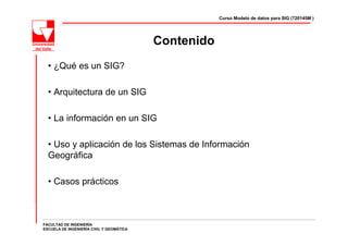 Este documento presenta la introducción a un curso sobre modelos de datos para SIG. Explica brevemente qué es un SIG, sus componentes principales como hardware, software, datos, personal y procedimientos. Luego describe los diferentes tipos de información que se pueden almacenar en un SIG, incluyendo información espacial como puntos, líneas y áreas, e información no espacial como listados, informes y conteos. Finalmente, menciona algunas funciones comunes de los SIG como captura y análisis de información.