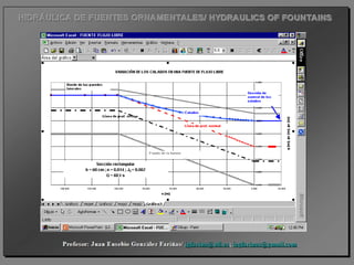Este documento presenta conceptos clave sobre flujos con superficie libre, incluyendo: el número de Froude, la sección de control, la geometría de la sección transversal, el calado crítico y el calado normal. También define parámetros geométricos como el área mojada, el perímetro mojado y el radio hidráulico para diferentes tipos de secciones. Explica cómo calcular el calado crítico y normal y provee ejemplos numéricos.