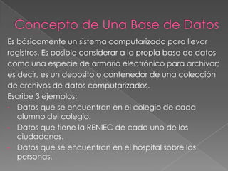 Un sistema de base de datos es un sistema computarizado para almacenar y recuperar información de forma organizada. Permite a los usuarios almacenar, actualizar y recuperar datos de forma eficiente mediante consultas.