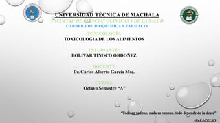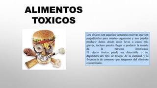 El documento discute la toxicología de los alimentos. Identifica varios alimentos tóxicos y sus efectos, incluyendo inhibidores de la colinesterasa en papas y berenjenas que causan efectos neurotóxicos, intoxicación por histamina que afecta el tracto gastrointestinal, y favismo que causa anemia hemolítica. También describe latirismo, neurolatirismo y osteolatirismo causados por el consumo de semillas de Lathyrus. Finalmente, distingue entre xenobióticos endógenos y exógenos en