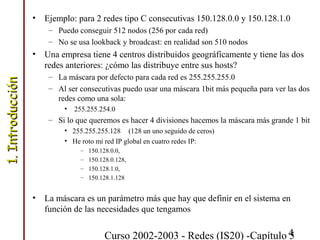 El documento explica cómo determinar si dos nodos pertenecen a la misma red mediante el uso de máscaras de red. También describe las clases de direcciones IP (A, B y C) y cómo se pueden subdividir las redes clase B en subredes mediante el uso de máscaras de red con bits adicionales establecidos. Por último, explica el proceso de envío de paquetes entre nodos en la misma red, incluido el uso del protocolo ARP para resolver las direcciones MAC.