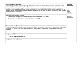 Este documento presenta la planificación de una clase de Geografía para estudiantes de 2° básico. La clase evaluará conocimientos previos sobre puntos cardinales a través de preguntas, juegos y una prueba. Luego, los estudiantes aprenderán sobre los puntos cardinales mediante una presentación en PowerPoint. Finalmente, se realizará un cierre con adivinanzas sobre objetos ubicados en el salón de clases usando conceptos como derecha e izquierda.